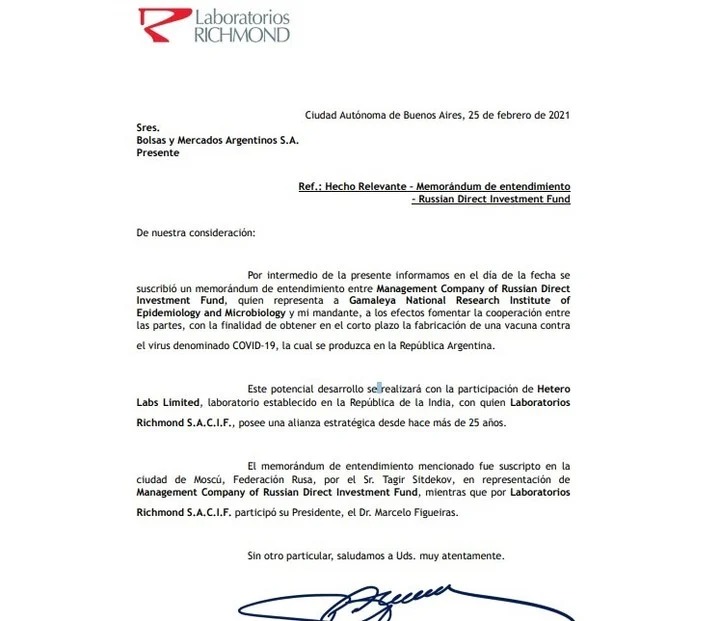 Y cierra: “El memorándum de entendimiento mencionado fue suscripto en la ciudad de Moscú, Federación Rusa, por el Sr. Tagir Sitdekov, en representación de Management Company of Russian Direct Investment Fund, mientras que por Laboratorios Richmond S.A.C.I.F. participó su Presidente, el Dr. Marcelo Figueiras”.