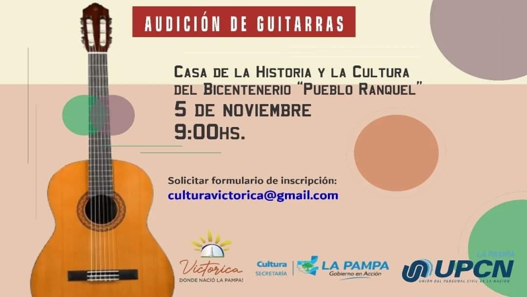 El proyecto «Comarca de Guitarras» invita a guitarristas de Victorica y alrededores a inscribirse para participar en la audición que se llevará a cabo el próximo martes 5 de noviembre a las 09:00 horas, en la Casa de la Historia y la Cultura del Bicentenario “Pueblo Ranquel”. La iniciativa busca seleccionar músicos para perfeccionarse en interpretación bajo la guía de reconocidos maestros, Mario Figueroa y Cristian Mitzig.